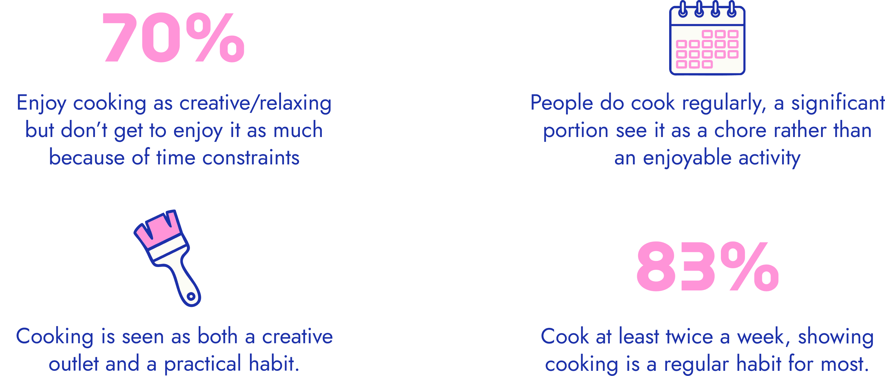 Our survey results reinforce what we heard in interviews — people like cooking, but time constraints and the mental load make it feel like a chore. Cooking holds a dual role in people’s lives — it’s both a creative outlet and a practical necessity.