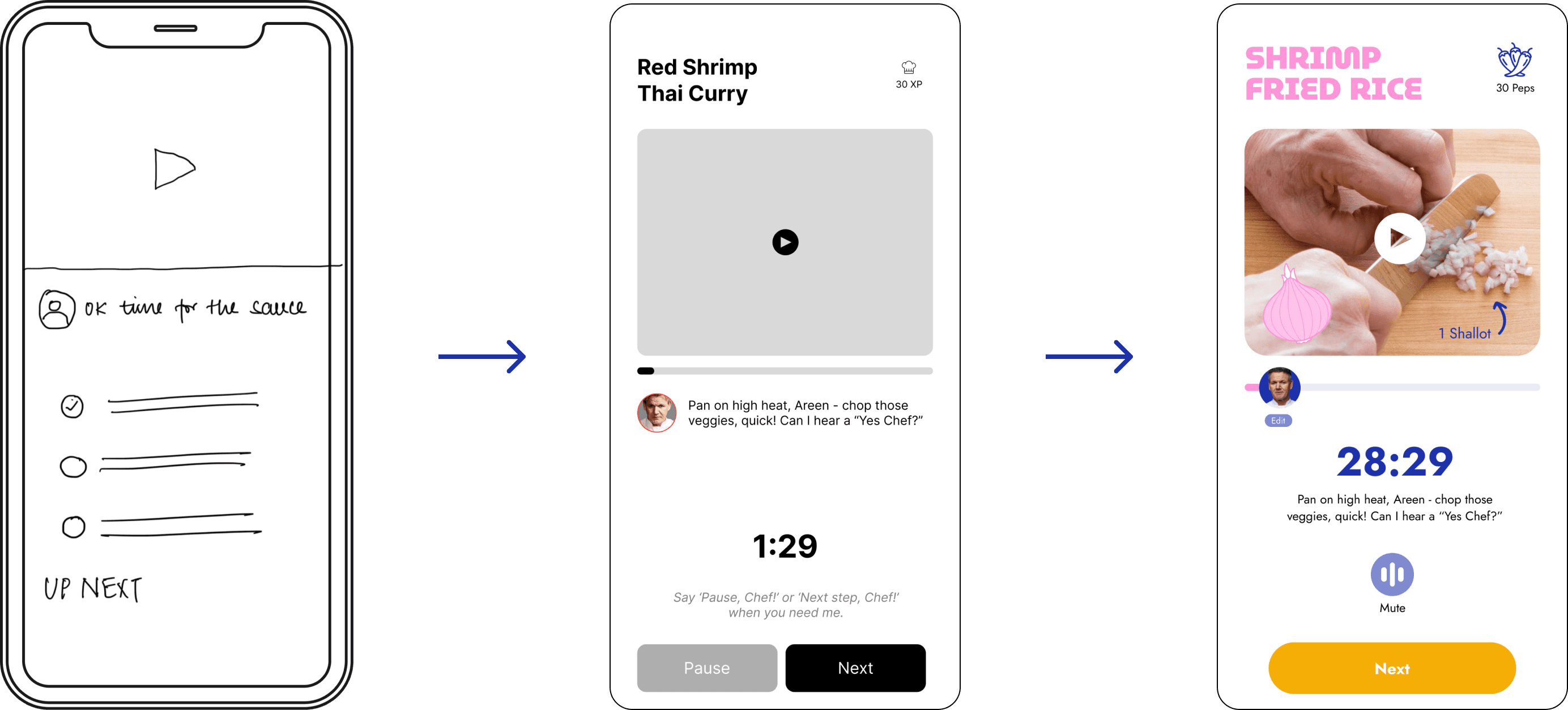 The AI chef introduces a guided, cook-along experience that reduces overwhelm and keeps users engaged throughout the cooking process. By layering in gamification, the experience becomes more motivating, encouraging users to continue even on low-energy days.