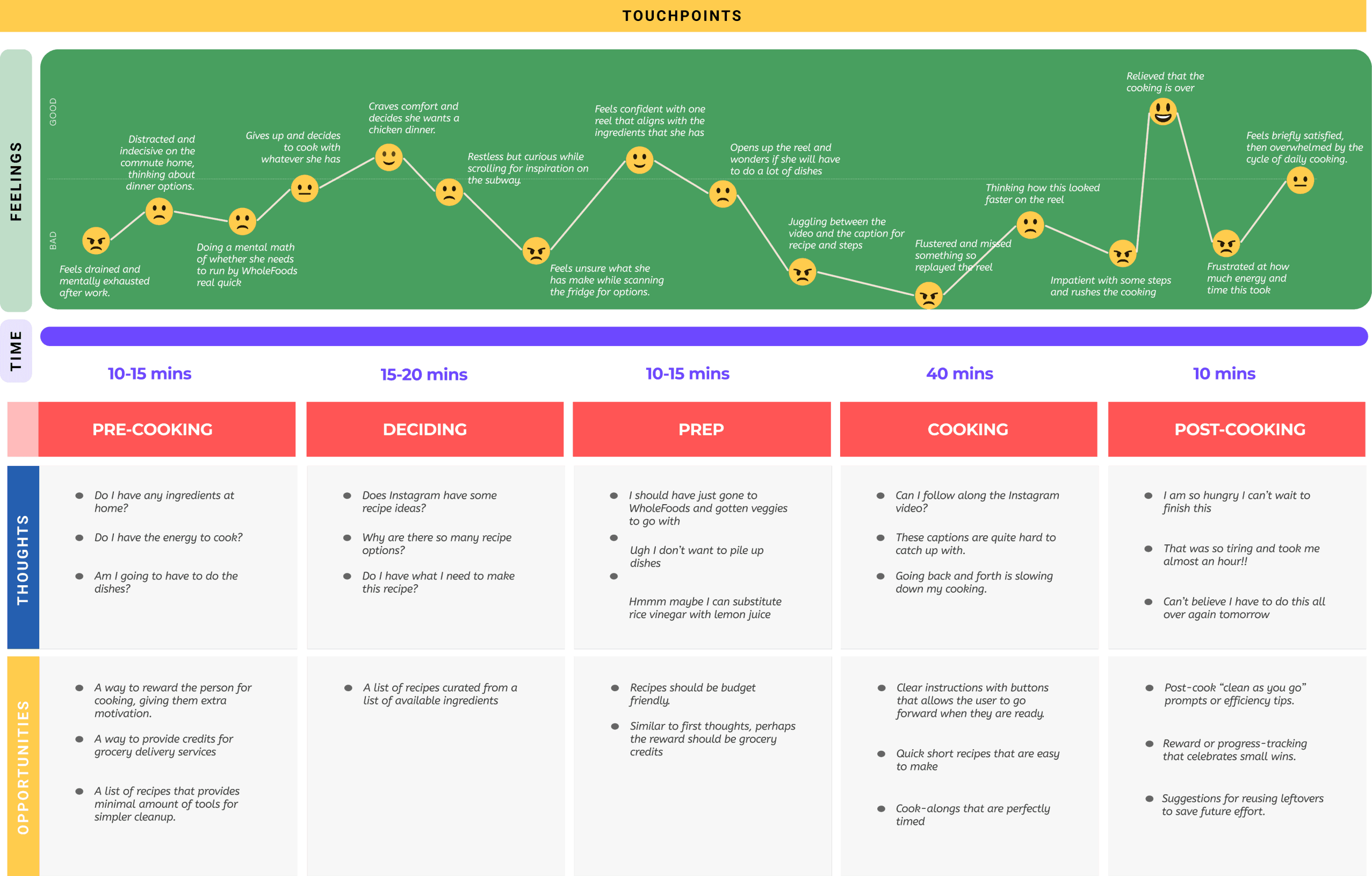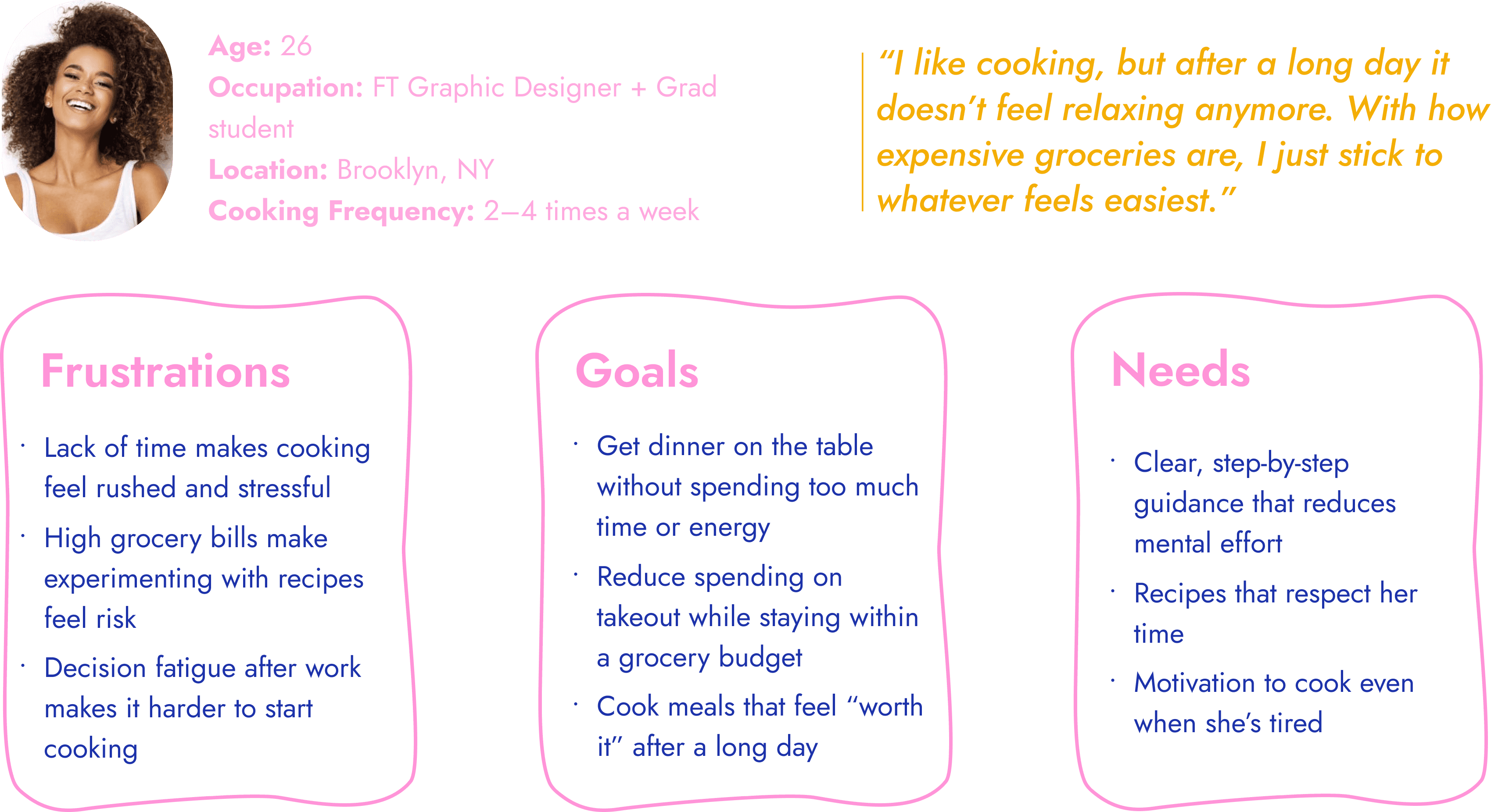 This is Maya, our primary user. She cooks a few times a week and actually likes cooking, but because of busy workdays, it no longer feels relaxing — it feels like a chore.