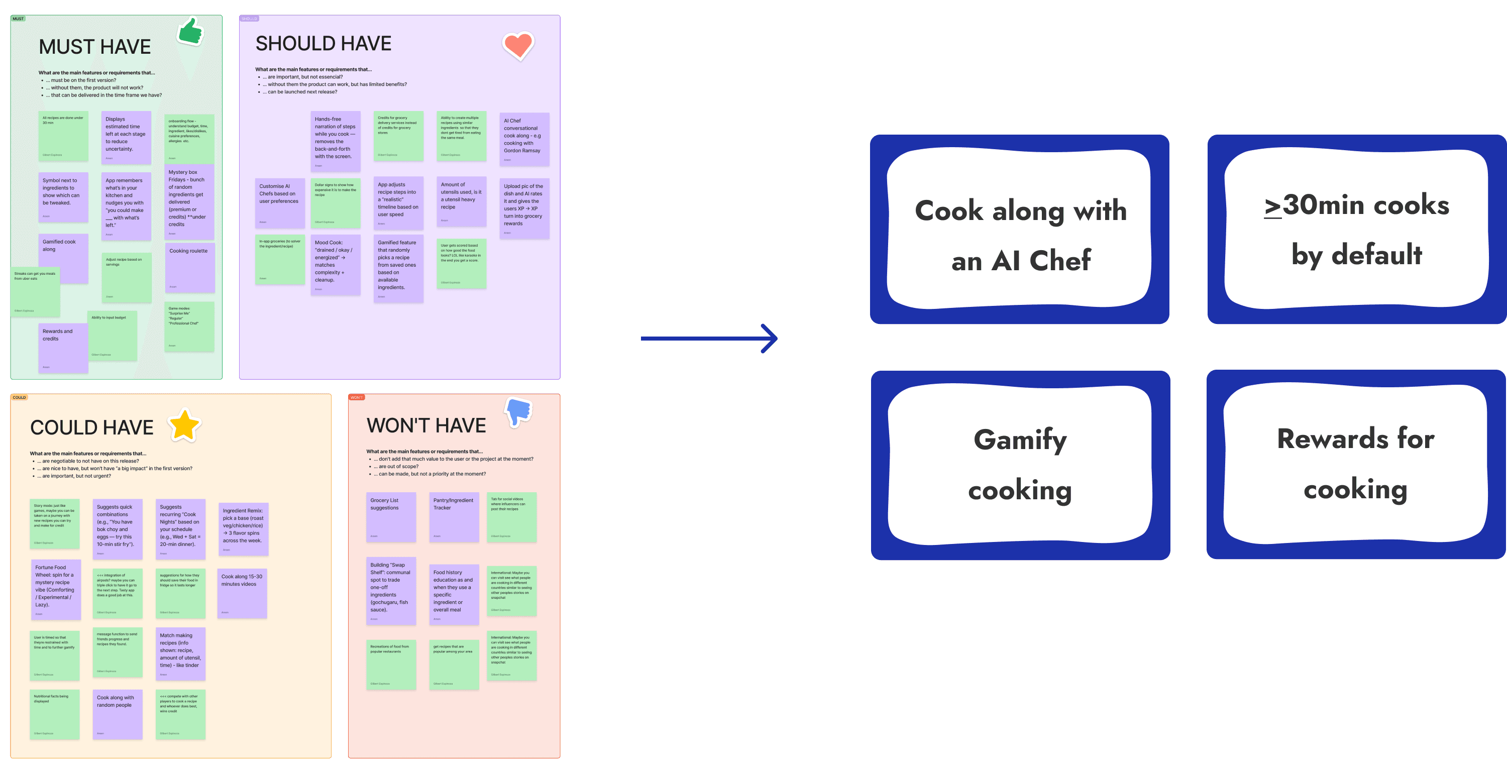 We used MoSCoW, SCAMPER, and mind mapping to explore a wide range of ideas and challenge existing assumptions around cooking.